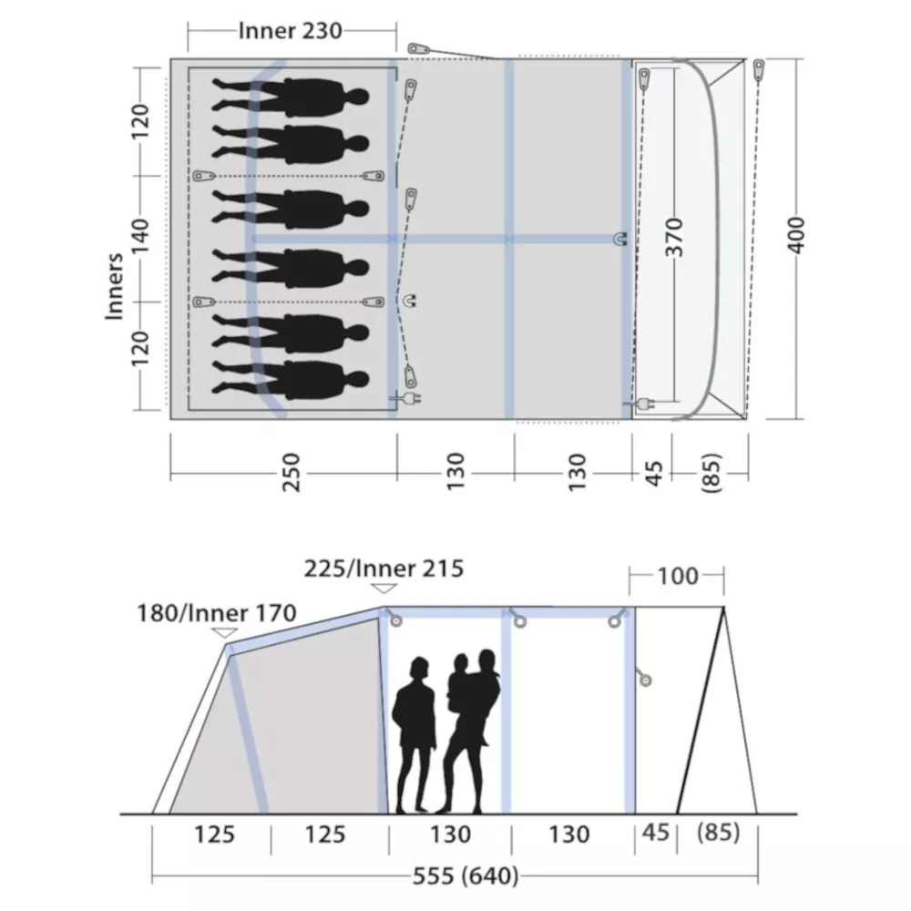 Steile Seitenwände optimieren den nutzbaren Raum im Zeltinneren. Die Innenhöhe im Wohnbereich bietet mit 215 cm viel Kopffreiheit.