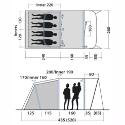 Steile Seitenwände optimieren den nutzbaren Raum im Zeltinneren. Eine Innenhöhe von 190 cm im Wohnbereich bietet reichlich Kopffreiheit. In dem gut 4 Quadratmeter grossen Wohnraum findet die Campingausrüstung, ein Campingtisch oder ein Zeltschrank Platz. Die grossen Fenster lassen viel Tageslicht nach innen. Die Front kann teilweise geöffnet werden und ist mit einem Doppelreissverschluss ausgestattet, ideal zum Lüften und zum Schutz vor Stechmücken und anderen lästigen Insekten. Mit dem praktischen Vordach hast du immer ein schattiges Plätzchen und Schutz vor Regen.