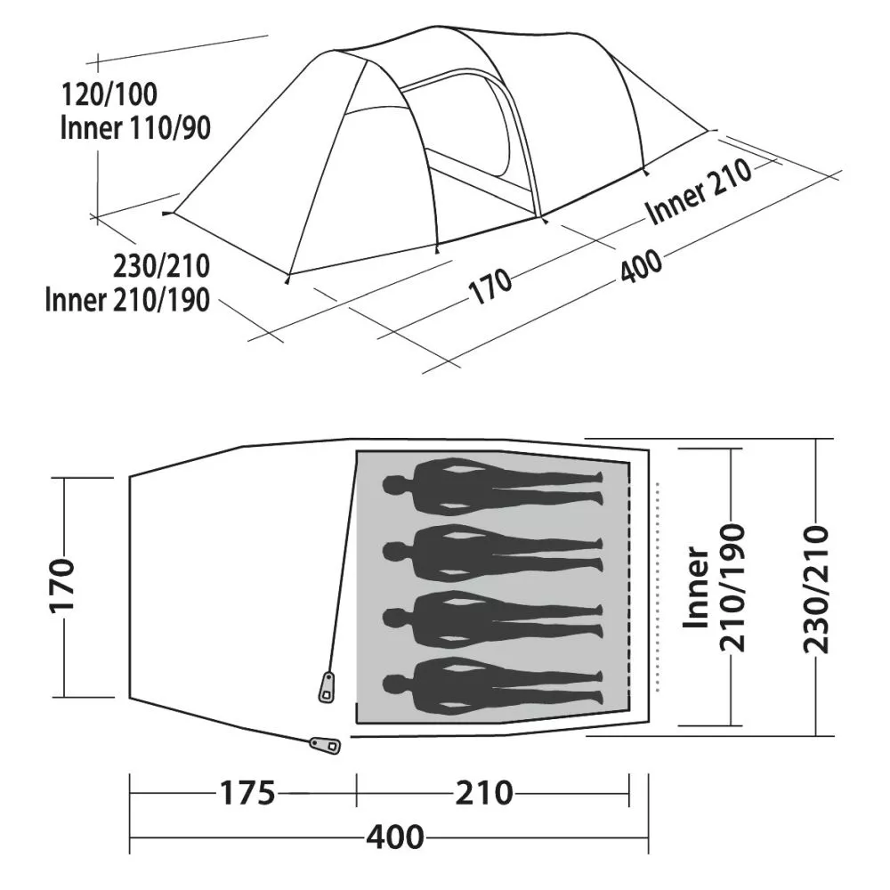 Überzelt: 180T, 100% Polyester, PU-beschichtet, flammhemmend, Wassersäule: 2.000 mm
