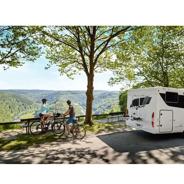 Der Fahrradträger bzw. Veloträger Thule Elite G2 HH wurde konsequent aus dem bewährten Thule Elite-Träger weiterentwickelt. Neu konzipiert wurden vor allem die Schienen, auf denen die verbesserten Radbefestigungen für die sichere Fixierung verschiebbar sind. Für besondere Sicherheit und Stabilität beim Fahrradtransport wurde der Thule Elite mit massiven ovalen Rohren aus anodisiertem Aluminium versehen. Spritzgussteile aus Kunststoff und Aluminium sorgen für qualitativ hochwertige Verarbeitung. Eine neue, innovative Plattformverriegelung sorgt dafür, dass der Träger auch bei holpriger Strecke keine ruckartigen Bewegungen macht. Der Träger ist mit mit 2 flexiblen Fahrradschienen ausgestattet, die für optimalen Komfort mit montiertem Fahrrad zur Seite verschoben werden können. Die Montage erfolgt mit einer robusten, unten angebrachten Befestigungsschiene mit unsichtbaren Befestigungspunkten. Durch diese Schiene und eine optionale Befestigungsschiene für die obere Befestigung wird die Last gleichmässig auf die Fahrzeugwand verteilt. Der Veloträger kann mit einer 3. variablen und einer 4. festen Schiene erweitert werden. Der stabile Tragrahmen für die Fahrräder ist bereits vormontiert und hat eine Tragfähigkeit von 60 kg (pro Schiene max. 30 kg); pro Fahrradschiene wird ein eigener Abstandshalter mit weicher Oberfläche mitgeliefert, geeignet für Fahrradholme bis Ø 70 mm. Der Fahrradträger bzw. Veloträger Thule Elite G2 HH eignet sich für die Montage an den werksseitig vorhandenen Halterungen von Dethleffs, LMC, Hobby und Hymer.