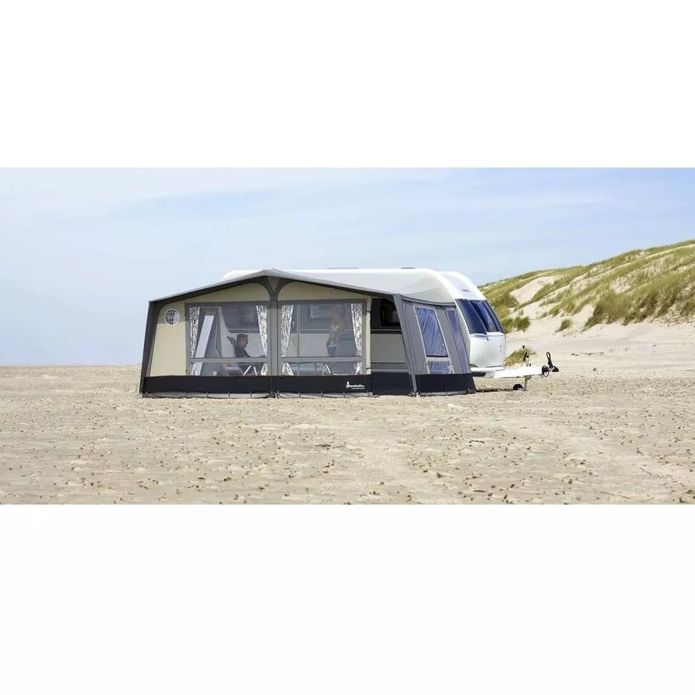 Das atmungsaktive Isacryl-Gewebe in den Vorder- und Seitenwänden sorgt, in Verbindung mit dem einseitig beschichtetem Dach (Textilunterseite), für ein gutes Raumklima. An heissen Tagen können die Vorder- und Seitenwände zu einer Veranda heruntergeklappt oder komplett herausgenommen werden, so dass ein grosses Sonnendach entsteht. Der Aufbau ist im Vergleich zu einem 250 cm tiefen Vorzelt nicht viel grösser. Das stabile Zinox-Megaframe-Gestänge verleiht dem Vorzelt gute Stabilität und eignet sich bestens fürs Ganzjahrescamping.